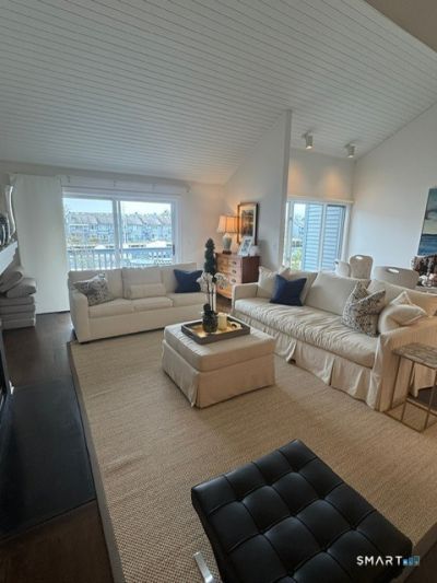 MODERN COASTAL LIVING in a secure gated community - sun drenched waterside open concept townhouse ready for your next chapter. Serene 2 bedroom + office (or 3rd bedroom) with three full baths and updated white kitchen featuring a window seat in the breakfast area. Hardwood floors throughout. Marina water views from the living room with soaring cathedral ceiling and cozy wood burning fireplace for winter nights. Gracious sliding doors open onto elevated deck facing the water. Enjoy dinners outside on summer nights! Ground floor primary bedroom also has sliding doors opening onto a deck where you can sip your coffee in the mornings. Primary bathroom with marble tile has a freestanding soaking tub and separate glass enclosed shower. Five ample closets including a walk in wardrobe and extra attic storage area. Elegant home with clean bright finishes has central air conditioning, full washer/dryer in the unit and one car garage for bikes, kayaks and paddleboards. Marina location at Charles Cove townhouse condominiums includes access to boardwalks, docks, pool, and tennis courts. Calf Pasture Beach amenities a short walk away. Tenant in place - need 24 hour notice