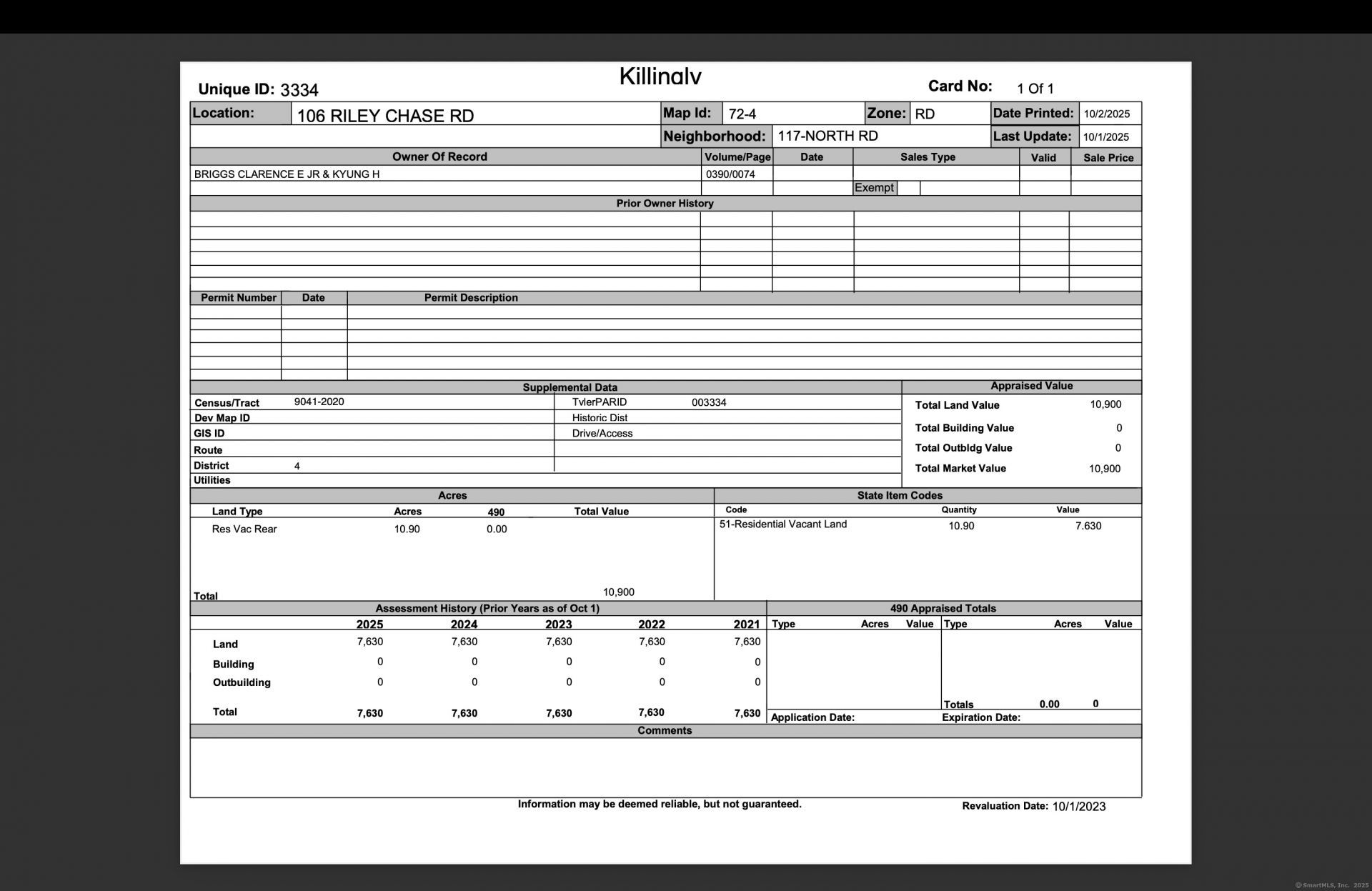 Discover the perfect opportunity to build your dream home or create a private retreat on this beautiful 10.9-acre parcel located at 106 Riley Chase Road, Killingly, CT. Nestled in a quiet, rural setting, this expansive property offers plenty of space, privacy, and natural beauty. The gently rolling terrain provides multiple potential building sites, while the mature trees and natural landscape create a peaceful backdrop. Key Features: * 10.9 acres of versatile land * Ideal for a single-family home, mini farm, or recreational getaway * Surrounded by nature with plenty of privacy * Easy access to major roads and nearby amenities * Located in a low-traffic, country setting while still being close to town Conveniently situated near the Rhode Island border and just a short drive to I-395, this property combines tranquility with accessibility. Whether you're looking to build now or invest for the future, this is an excellent opportunity at an affordable price point. Don't miss out on this peaceful slice of New England countryside. Schedule a walk-through today and imagine the possibilities! Buyer to do own due diligence and confirm zoning approval.