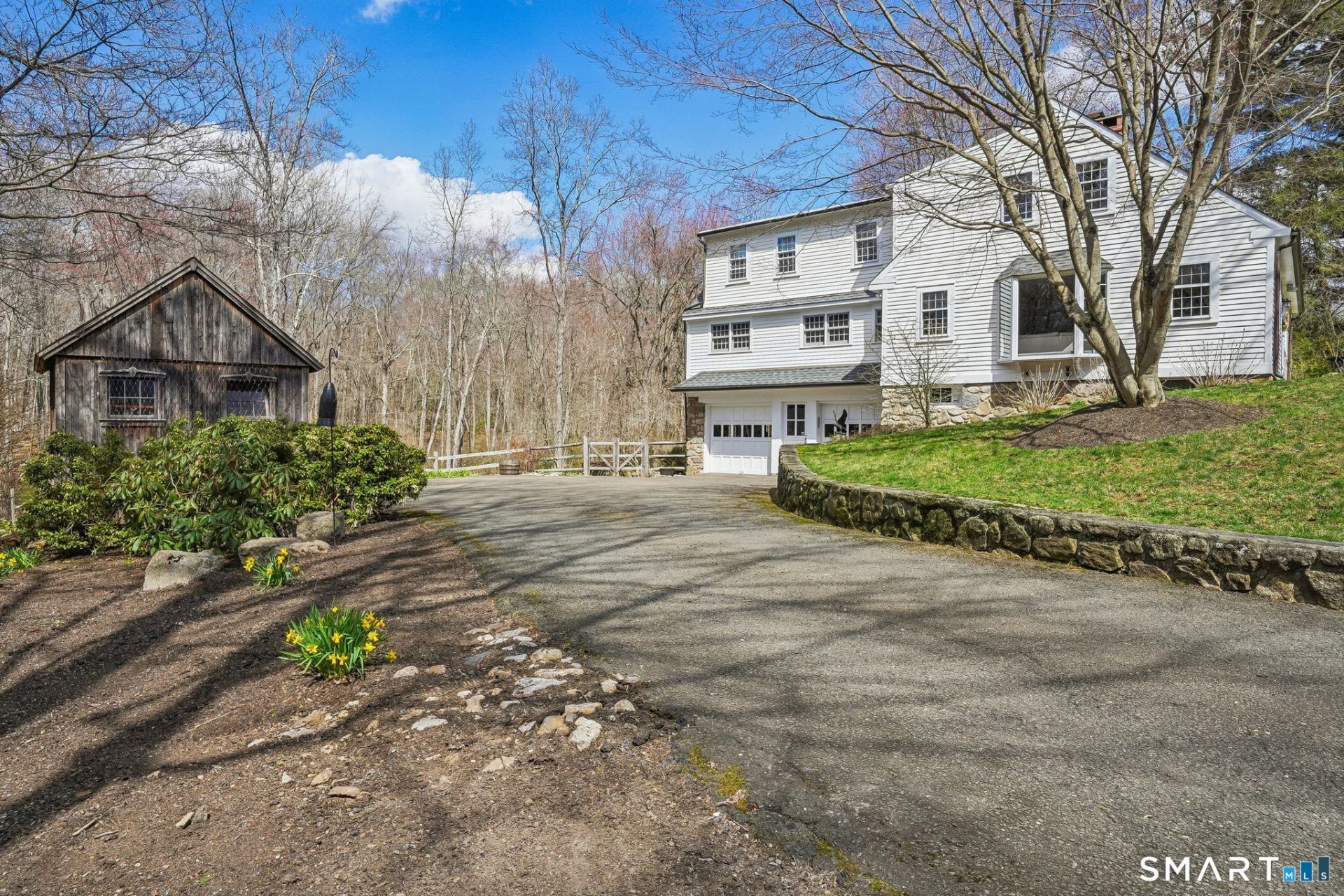 Unique "Antique" Expanded Cape, brimming with charm and character, featuring wide-plank wood floors, wooden beams and three working fireplaces. The spacious living room and dining room flow into an eat-in "country-style" chef's kitchen, offering double sinks, double dishwashers, two wall ovens and custom cabinetry; along with a wetbar, just around the corner, perfect for dinner parties and/or your morning coffee station. The vaulted ceiling family room with wood burning stove leads way to a stone patio with six-person hot tub; the perfect end to a long day! Home office with built-ins, first floor bedroom and a full, updated bath make entertaining a breeze. Upstairs, you'll find three generously-sized bedrooms, including a primary suite with its own full bath, double sinks and radiant heated floors. Additional updates include: New C/A (2024), Exterior Paint (2024), Interior Paint (24'/26') Kitchen Appliances (23'/24'/25'), First floor shower (2025). Two-car attached garage, abundant storage space, copper gutters, exterior shed and professionally landscaped grounds with seasonal blooms, make this the perfect countryside retreat. Private access through the rear, fenced-in yard to Cherry Lane Park, a 50-acre town park with walking trails and pond. Conveniently located with easy access to the Merritt Parkway, Route 7 and I95, and minutes away from Wilton Center and Downtown Westport make this a rare opportunity, you don't want to miss. Schedule an appointment to preview tod