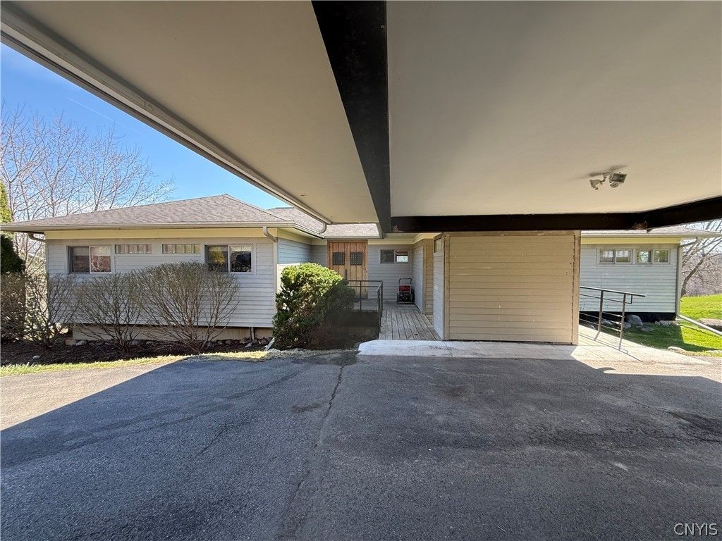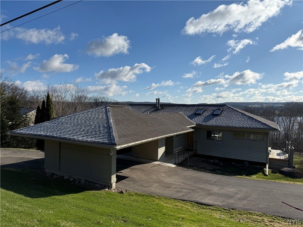 Wake up to breathtaking sunrises over Otisco Lake in this custom-built home inspired by the timeless design principles of Frank Lloyd Wright. Thoughtfully designed to embrace its natural surroundings, the home features rich cherry hardwood floors, custom cherry kitchen cabinetry, four bedrooms, and three full bathrooms. A spacious covered deck overlooks the lake, creating an ideal setting for outdoor dining and relaxation. The dining room, living room with vaulted ceiling and beautiful gas fireplace, kitchen, and primary bedroom all enjoy stunning panoramic views of Otisco Lake. The Seller and listing agent estimated +860 square feet of additional finished living space added in 2008 to the walkout basement that has a patio and serene water views. This level offers a kitchenette, expansive family room with wood-burning stove and indirect lighting, a full bath, and a large bedroom with full pocket doors. The basement also includes a shop/storage area. The Seller owns one of five shares of Lakeside Deck, LLC, waterfront property located approximately 1/4 mile north of 2334 State Route 174, tax map #06.-03-24.0. This share will be conveyed to the Buyer at closing. Waterfront expenses, repairs, and taxes are shared equally among the five owners. Access includes stairs leading to the waterfront deck, where boats may be stored. According to association members, there is space for a mooring or hoist in front of the approximately 50-foot waterfront lot, if desired. Please note there is no parking available at the waterfront access. It is just a short distance from the home. Some photos have been virtually staged. There are cameras on site. Taxes reflect no exemptions.