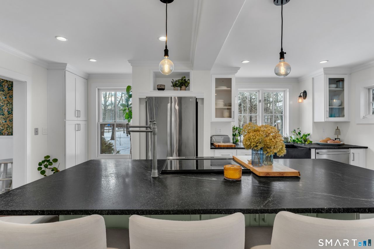 This 1900s colonial farmhouse located in the historic village of Hadlyme is truly brimming with charm. This delightful home invites you into a spacious living room where sunlight pours through vintage windows. The oversized eat in kitchen, tastefully updated with soapstone countertops and stainless appliances, offers all the modern conveniences, yet preserves its classic appeal. Ideal for both culinary adventures and lively gatherings, its design and functionality can't be missed! A large patio area off the kitchen is perfect for outdoor entertaining or enjoying a relaxing evening. Finishing off the main level is a formal dining room with built in hutch and solarium for the plant lover, plus a small office/exercise room and half bath. Upstairs boasts 3 spacious bedrooms, including a master bedroom suite with full remodeled bath. Adding to the property's unique charm is a historic barn/garage, with its weathered wood and traditional architecture. This home is also equipped with modern solar panels, harnessing the abundant sunlight to provide renewable energy throughout the home. Located at the four corners of Hadlyme, this rare find is a short distance from the Connecticut River, Gilette Castle and the Chester-Hadlyme ferry - opening up endless possibilities for dining and entertainment! With its harmonious blend of historic character and inviting atmosphere, this house is truly a place to create lasting memories.