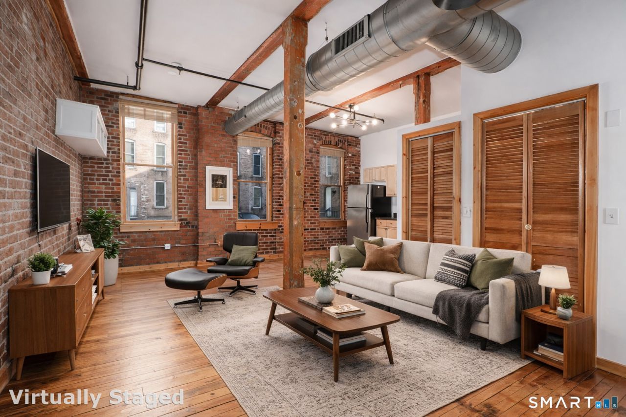 Welcome to The Lofts on Lafayette, where industrial character meets modern comfort in this turnkey New York style loft located in the historic Warner Brothers Corset Factory. This distinctive 2 bedroom residence features soaring ceilings, exposed brick, original hardwood floors, and large street facing windows that fill the space with natural light. Unique architectural details including a preserved factory vault door and original elevator shaft doors add a true one of a kind element. The open concept layout offers a seamless flow between kitchen, dining, and living areas. Updated kitchen and bath with stainless steel appliances, new HVAC with central air, new furnace, new hot water heater, and in-unit laundry complete the home. Two generously sized bedrooms offer excellent storage with oversized closets and double hanging space. Located in a gated, pet friendly community with no rental restrictions, this property presents a strong opportunity for investors, as well as owner occupants. Includes one assigned parking space and Amazon package lockers. Ideally situated just two blocks from Seaside Park and convenient to downtown Bridgeport, restaurants, entertainment, Metro-North train, ferry, bus lines, and I-95. Close to Hartford HealthCare Amphitheater, Total Mortgage Arena, Steelpointe Harbor, University of Bridgeport, and Housatonic Community College, making it an excellent option for commuters, working professionals or investors.