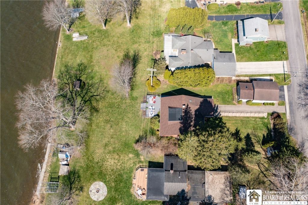 It's all about the lake here at Overlook Terrace! This charming lakefront home located in highly desirable Bemus Pt is a true must-see! With its 75 feet of lake frontage and a surprisingly spacious interior it's perfect for both relaxing & entertaining. Step inside the entry room which is large and inviting to discover an open-air concept layout featuring 5 bedrooms and 2 1/2 baths, thoughtfully designed to accommodate family and guests. Enjoy captivating lake views from the modern up to date kitchen or in the dining room where you will experience breathtaking lake views. With its architectural charm and its warm wood accents, the dining room is a highlight of the home. The 1st floor wing offers a private escape, complete with a primary bedroom, a full bath, and convenient laundry room that doubles as an office. The living room is centrally located and is warm & inviting, a great place to entertain. The 2nd bedroom on the 1st floor is currently being used as an office, you decide! Upstairs you'll find 3 generously sized bedrooms with ample storage, including a cedar closet. Several closets for seasonal storage. The full bath upstairs services all 3 bedrooms. Outdoor living is impressive, with a lakeside storage shed ideal for paddle boards, kayaks, and all water essentials. A flexible workshop attached to the rear of the garage with lake facing windows offers endless possibilities. Use this flex space as a studio, or creative retreat. The partial basement provides additional storage & houses the home's utilities. This unique hillside setting provides stunning lake views, best enjoyed from the expansive new composite deck. Whether you're sipping morning coffee under cover or soaking up sunshine in the open air, this lakeside retreat is made for year round enjoyment! Located just a short boat or bike ride from the heart of Bemus Point, this property combines privacy, convenience, and the best of lake life! Don't let another sunset pass you by without enjoying it here, lakeside on Overlook terrace.