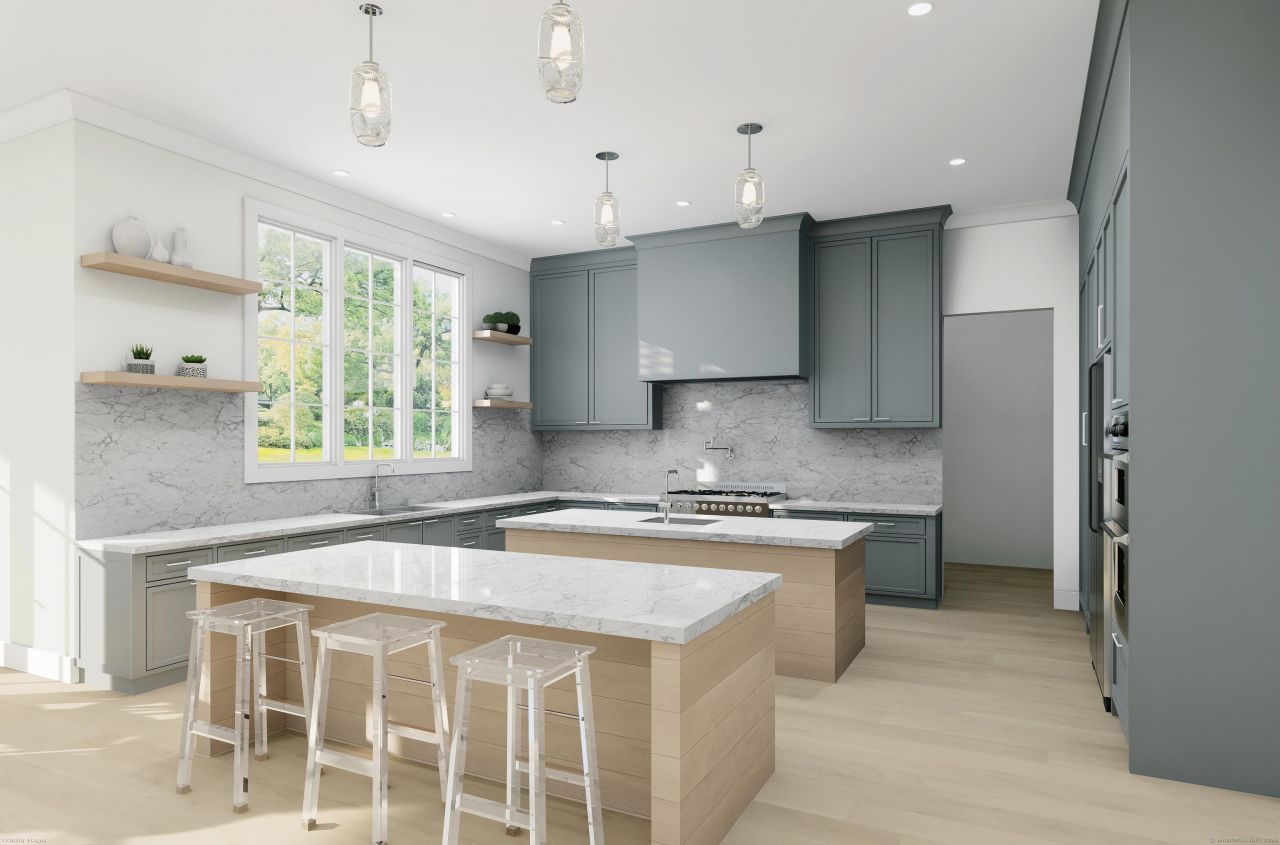 Perched high on a hill in downtown Greenwich, 66 Dearfield is unparalleled in its grandeur with 10,646 square feet of luxury living spanning 4 floors. Walk to Greenwich Library, Greenwich Avenue, the train and all downtown amenities. This exquisite colonial boasts stone chimneys with extra height ceilings on each floor. Upon entry, the 2 story foyer nestled between the living room and dining room unfolds into a stunning layout featuring expansive family room with fireplace, divine dinette adjacent to chef's kitchen accented by 2 islands containing Wolfe and Sub Zero appliances connected to an elegant butler's pantry/bar; first floor spacious bedroom with ensuite bath and magnificent library conclude the first floor. Extraordinary primary suite hosts his and her baths, fireplace, 2 story closets, sitting room and an outdoor deck; upstairs laundry and 5 additional bedrooms with ensuite baths round out the second floor. Garden level highlights include media room, gym, wine room, guest bedroom with ensuite bath, 2nd laundry room with pet shower, as well as multiple flex and play areas with walk out access to level backyard. Top level details include wet bar, recreation spaces and his and her offices. Indoor/outdoor experience is complete with oversize stone patio opening to 20' x 40' salt water pool. Own this unique property to be finished by year end 2025. Customization possible.