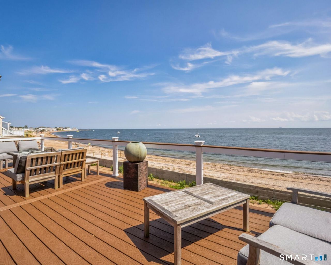 Waterfront on Morgan Point with 125' private sandy beach and southeast exposure, offering sweeping Long Island Sound views and beautiful morning light. Set between the shoreline and protected marshland, this property delivers rare privacy and a true coastal retreat setting. The main level features water views, including from the primary bedroom, and is designed for indoor-outdoor living with a folding glass door to the deck and a gas-strut pass-through window with granite counters extending outside. A three-season room surrounded by large sliding glass doors connects to a paver patio with firepit and additional outdoor space. Additional features include heat pumps, enhanced insulation, shake-style siding, fenced yard, ample parking, and available survey and elevation documentation.
