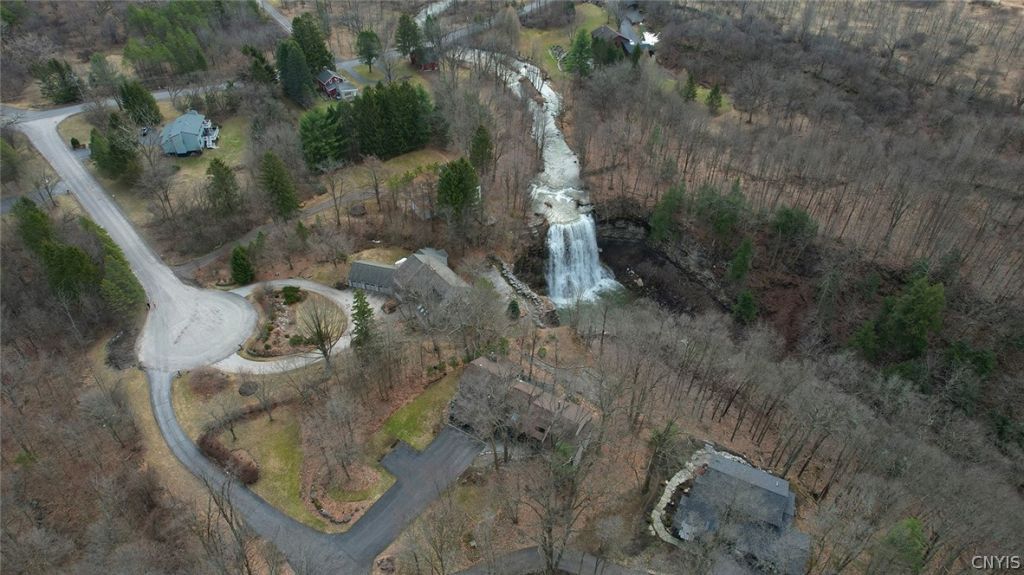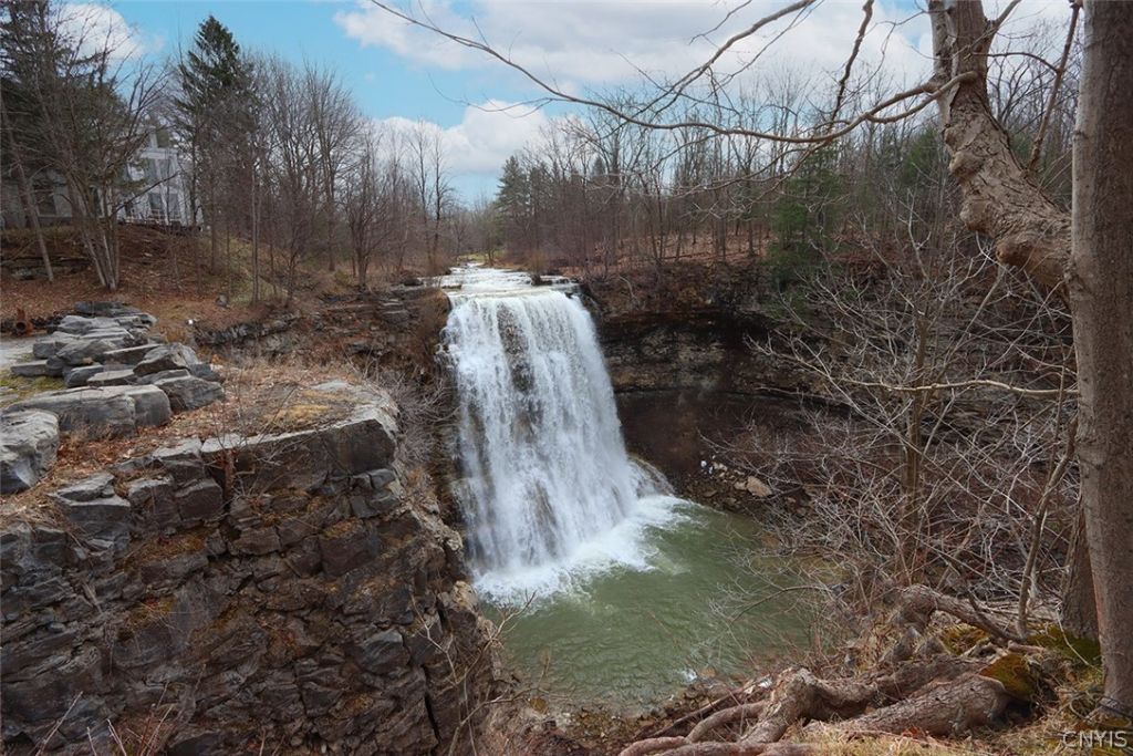 Harmony of man and nature can be found with this stylish contemporary home set on 3.42 acres surrounded by a wooded backdrop, lush landscaping and breathtaking views of Brickyard Falls. The open floor plan is highlighted by gleaming hardwood floors and distinctive architectural details found throughout, while walls of windows capture sweeping views of the falls. Step into the sunken living room with vaulted ceilings and a dramatic floor to ceiling feature wall. A fireplace becomes the centerpiece, framed by symmetrical built in display alcoves that add refined interest. Above the mantel, an angular mirror rises to the peak of the vault, reflecting light and enhancing the room's openness. The formal dining room showcases a tiered Capiz shell chandelier and a dividing wall from the kitchen, creates separation while maintaining a spacious feel with pass-through openings on both ends. Built in display niches with glass shelves add visual interest and space for d?cor. The gourmet kitchen is a culinary delight boasting an island with breakfast bar, solid surface countertops, ample cupboard space, double ovens and stainless-steel appliances. An eat in area is filled with natural light from a glass wall and skylights. Adjacent, the family room features a cozy fireplace, vaulted ceiling, slider to the back deck and large windows showcasing more spectacular views of the falls. The primary suite is located on the main floor with a walk-in closet and ensuite. Completing this level are two powder rooms, a laundry center and mudroom. Upstairs has three bedrooms and a shared full bathroom. The walkout lower level includes an additional 1000 sq ft of versatile living space ideal for media, recreation or exercise. There is also a fifth bedroom with a large walk-in closet and full bathroom. Outside, relax on the multi-level deck, an inviting space to enjoy the tranquil surroundings and the soothing sounds of the falls while overlooking the tree filled landscape. Located adjacent to 50 acres owned by the CNY Land Trust and close to schools, shopping, downtown, hospitals and major routes, adding to the appeal of this unique property. FM Schools! Delayed showings till 4/11 at 10 am.